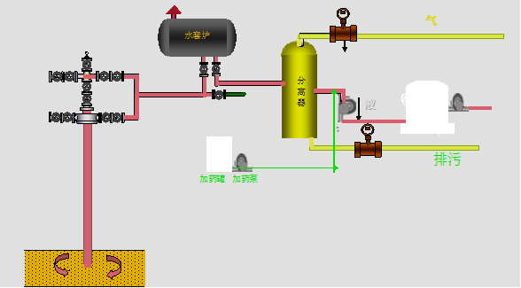 原油脫硫一般采取直接注入原油中, 在三相分離器后加藥,設備需要一臺注入泵和一個分散器或霧化器裝在管道中央。上游的注入點和下游的接受器之間要有足夠的距離,以確保有充足的反應時間,處理后原油逸出H2S的指標低于10PPm以下。生成產物一般為多硫化合物鹽,性能穩定,經過聯合站破乳脫水后,隨污水排出。工藝流程如圖下: